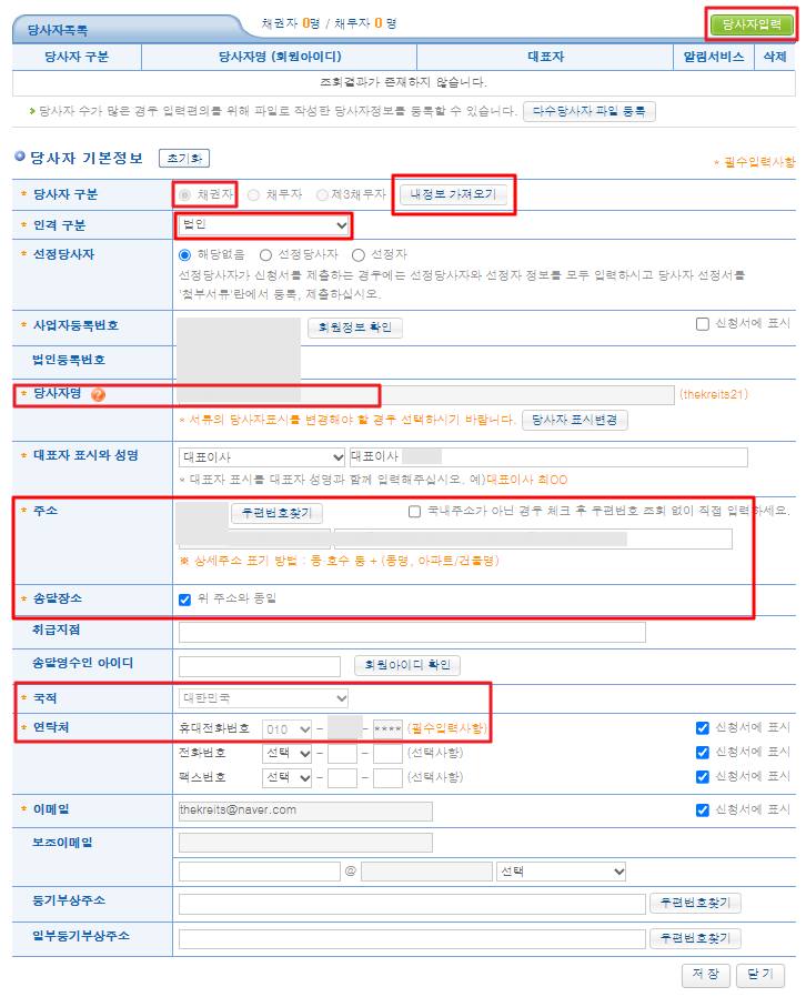 4) 당사자(채권자) 정보를 입력합니다.