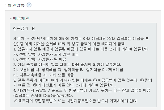 작성예시를 누르면 채권압류 > 예금채권에 대한 예시문구를 볼 수 있습니다 (아래 참조)