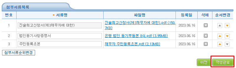 모든 서류가 첨부되면 아래와 같이 첨부 완료된 것을 확인하실 수 있습니다.