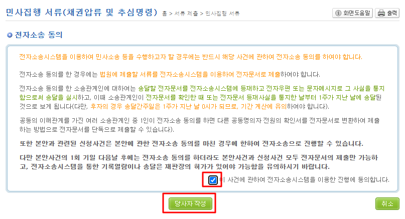 체크박스 체크 후, '당사자 작성'을 클릭합니다.