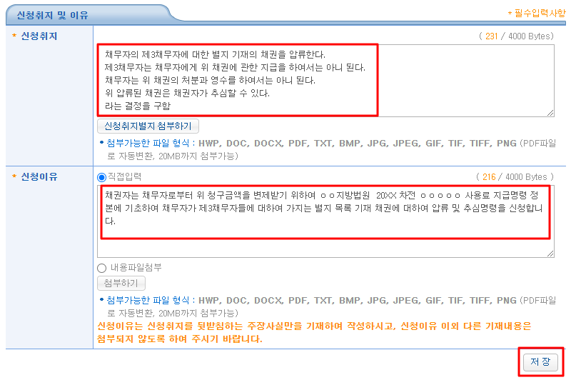 위 글을 클릭하면 자동으로 위와 같이 내용이 입력됩니다. 그 후 필요한 부분만 수정하시면 됩니다. ※ 채무자의 주민등록번호 또는 사업자등록번호를 반드시 기재하여야 합니다.