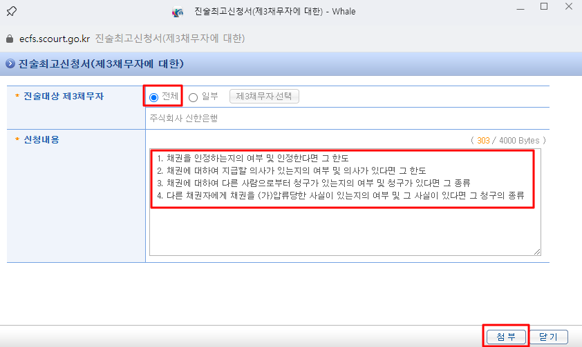 진술대상 '전체'(8개 금융기관을 입력하셨으면, 8개 기관명이 뜹니다), 신청내용은 그대로 두시고, '첨부'를 클릭합니다.
