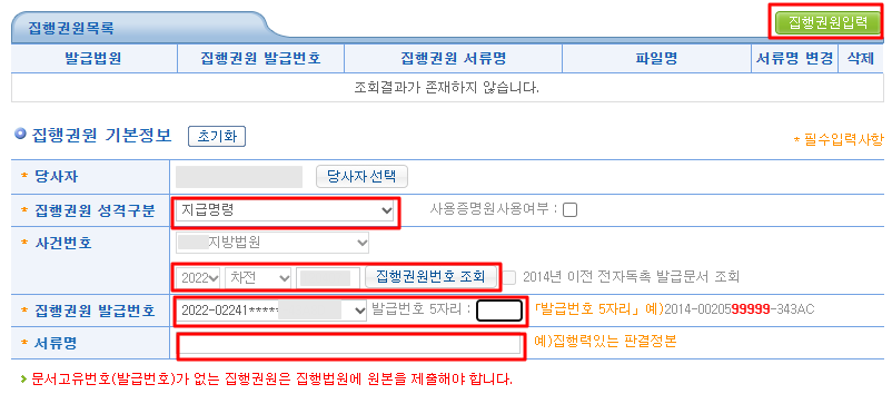 집행권원 발급번호를 선택합니다.