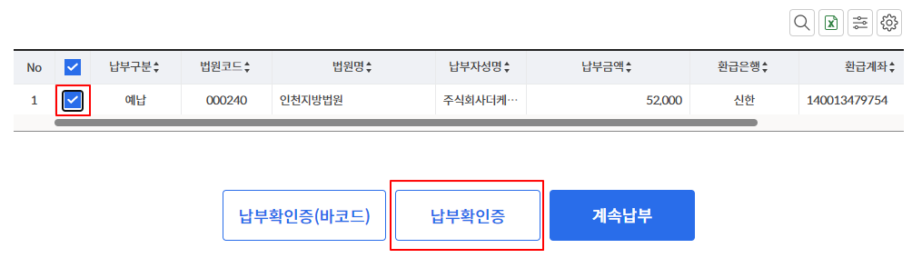 체크박스 체크 후 '납부확인증'을 누릅니다.