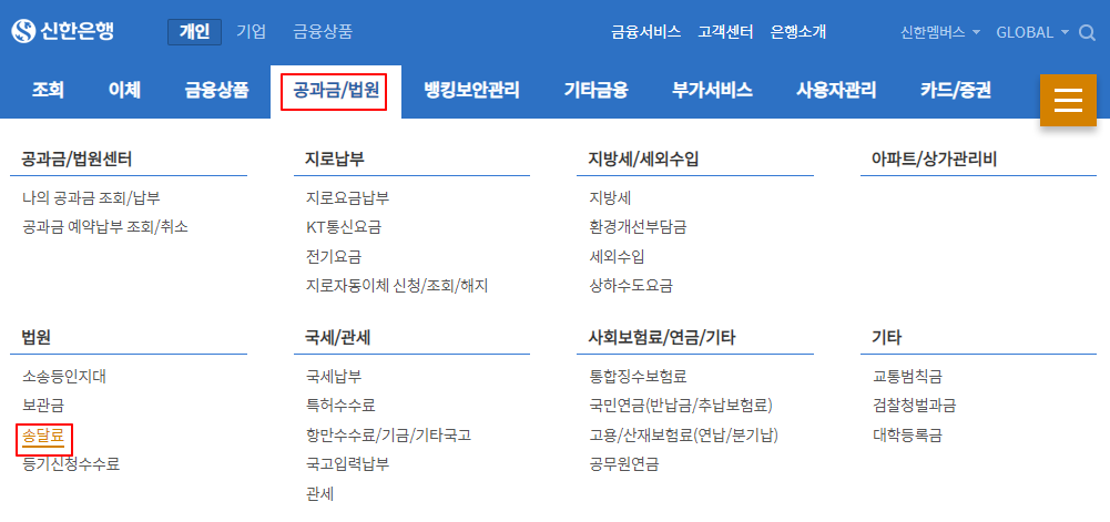 로그인 후, 공과금/법원 > 송달료를 클릭합니다.