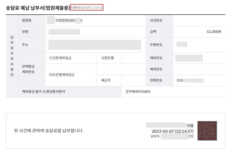 상단에 '은행번호'가 중요합니다. 전자소송 송달료납부 정보에 위 '은행번호'를 입력해야 하기 때문입니다.