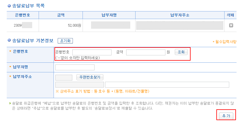 전자소송으로 돌아가서 '은행정보'를 입력하고 '조회'를 누르고, 납부자명, 주소 모두 입력 후 '추가'를 누르면 납부목록에 추가 됩니다.