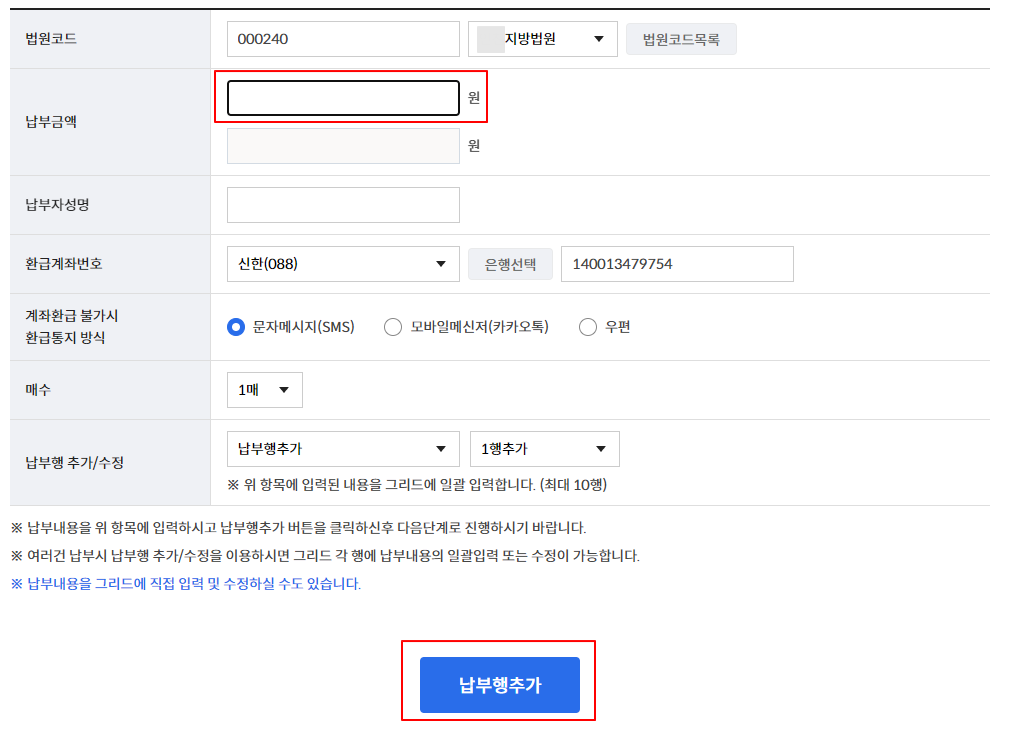 법원을 선택한 후, 납부금액을 입력합니다. 송달료 금액은 사건 종류에 따라 다르며, 아래 창에서 조회해보실 수 있습니다.