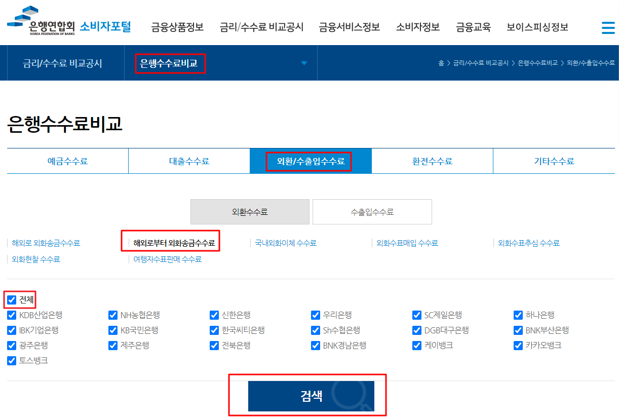 ▲ 해외로부터 외화송금수수료로 들어가서 '전체 은행' 체크 후 '검색'을 누릅니다.
