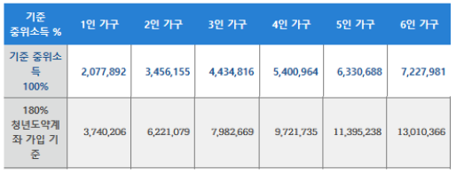 개인소득 6,000만 원 이하이고, 가구 소득(청년 가입자 본인의 주민등록상 등재된 가족 모두의 소득 합산)이 중위소득 대비 180% 이하여야 합니다. 예들 들면, 3인 가구의 경우 가구 월소득이 7,982,669원 이하여야 가입가능합니다.