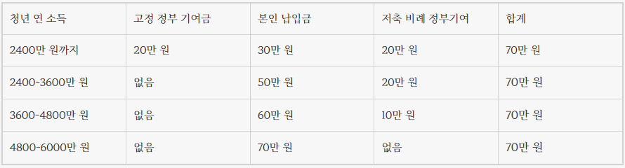 가입한 청년이 납입금을 부으면 거기에 상응해서 정부가 지원금을 적립해 주는 상품입니다. 납입기간은 5년입니다. 월 40만 원~70만 원씩 납입하면, 정부 지원금과 함께 목돈 5천만 원을 만들어주는 사업입니다. 이자 소득세는 없습니다. 만기 시 최대 수령 가능액은 5천만 원입니다.