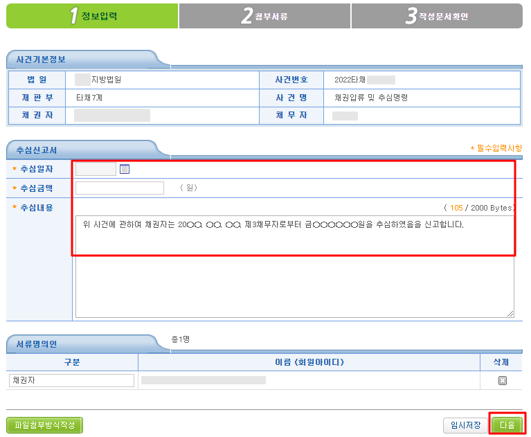 추심일자, 추심금액(채무자한테 받은 금액), 추심내용(언제 얼마를 돌려 받았는지)을 적은 후 '다음'을 누릅니다.