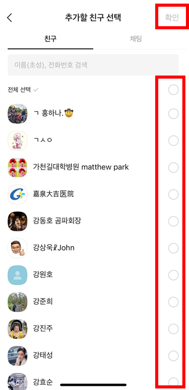 5. 멀티프로필을 보여줄 친구를 선택 후 '확인'을 누릅니다. 이 친구들에게는 '멀티프로필'이 보여집니다.