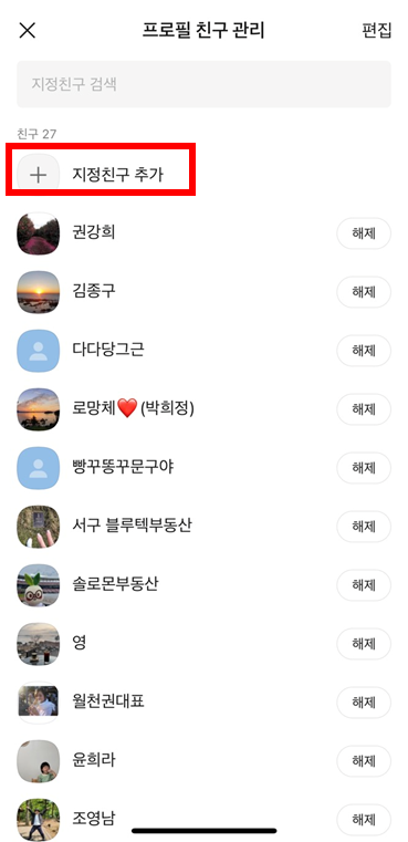 4. 지정친구 추가를 누릅니다. (멀티프로필을 보여줄 친구 추가하기)