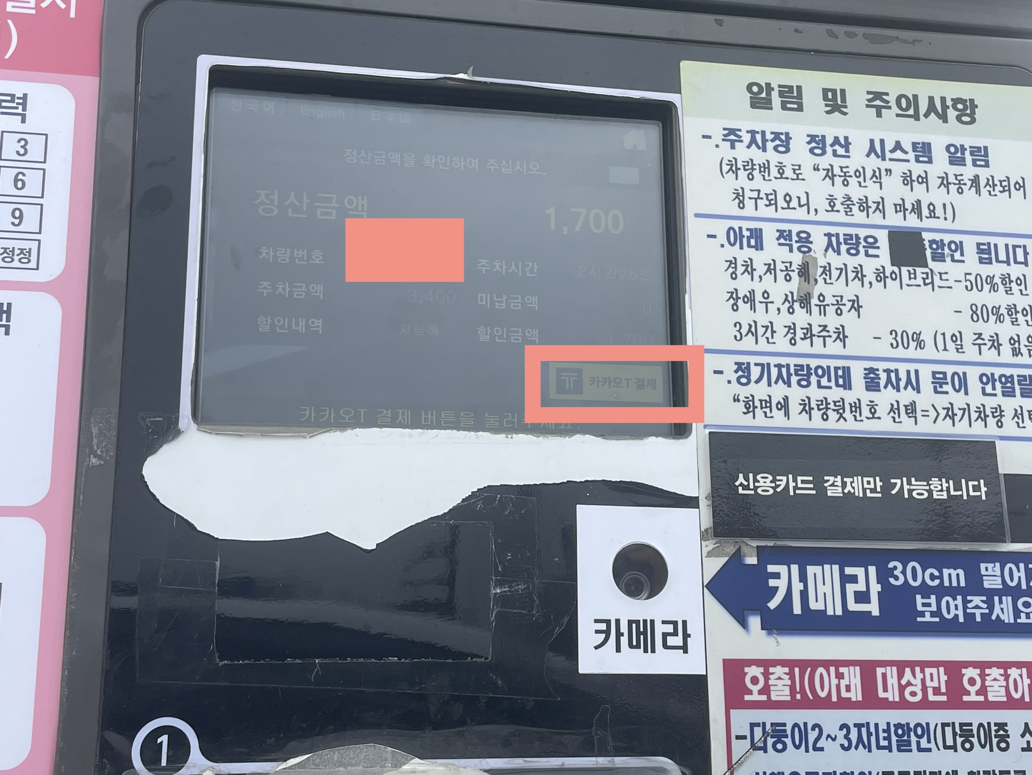 주차 정산기 화면에서 ‘카카오T 결제’를 누릅니다. 카카오내비 어플에 등록된 신용카드로 자동 결제가 이루어집니다. 바로 출차하시면 됩니다.