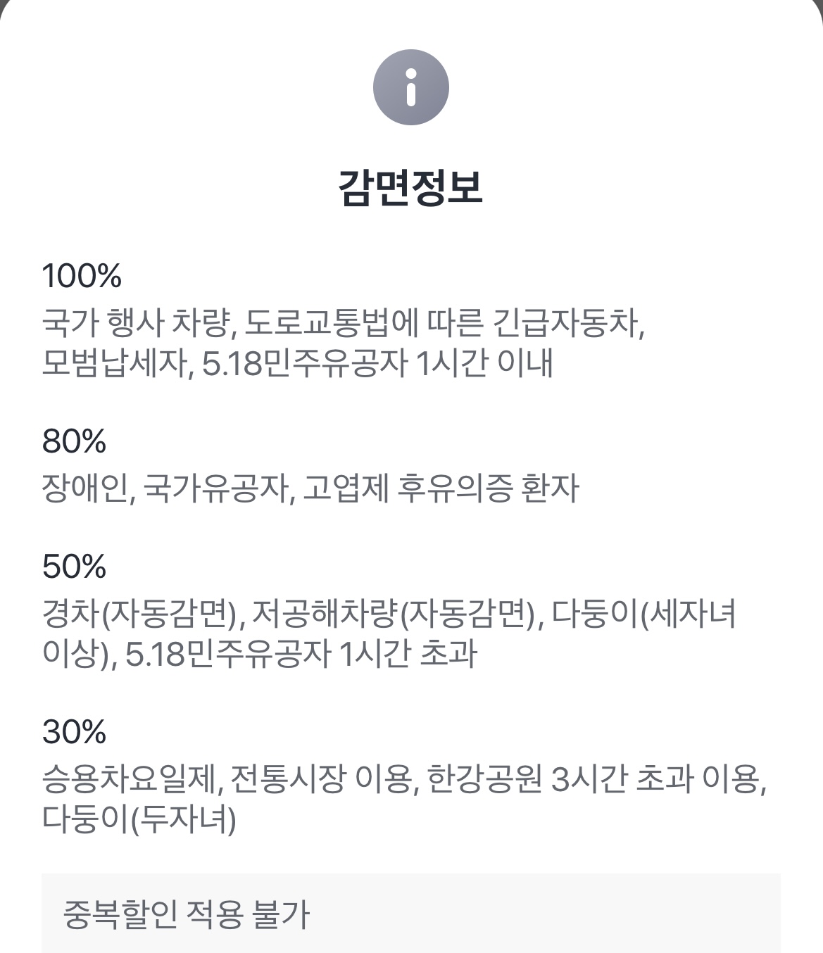 감면정보를 보고 싶으시면 물음표(?)를 클릭하시면 아래와 같이 감면 정보를 보실 수 있습니다.