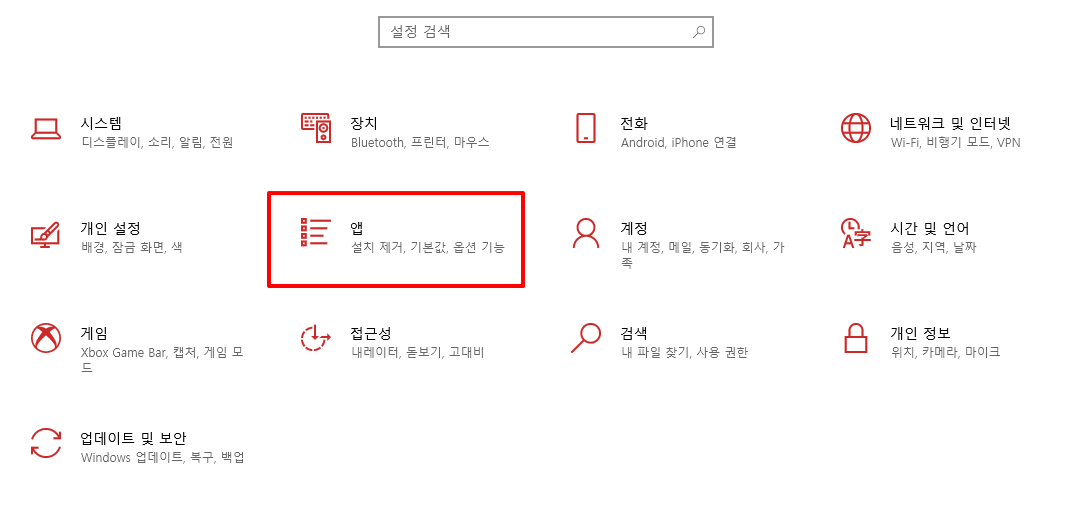 바탕화면 좌측하단 '윈도우' 버튼 클릭 → '설정'(톱니바퀴) 클릭 → 중간 '앱' 클릭합니다.