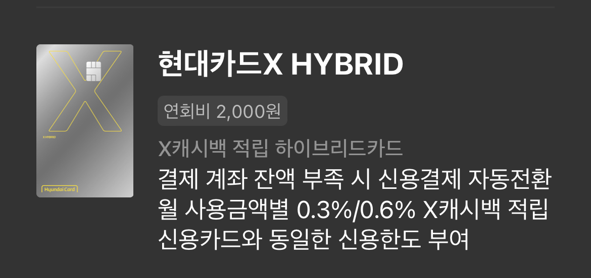 현대카드 X HYBRID 카드를 선택하였습니다.