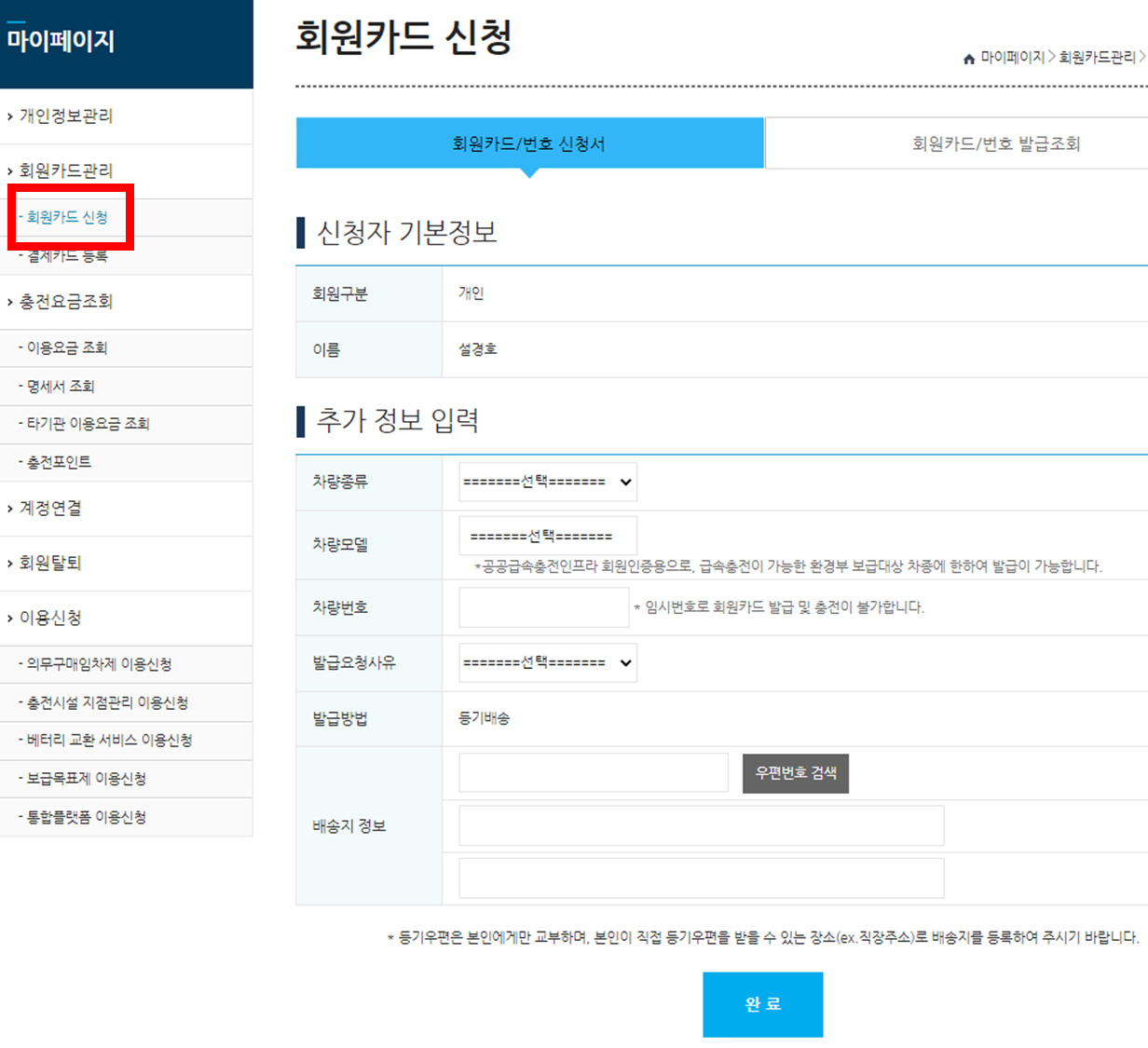 마이페이지 > 회원카드 신청에 들어가서 '신청서' 작성 후 '완료' 버튼을 누릅니다.