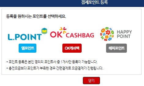 포인트결제 원하는 것을 선택합니다. 포인트로 결제가 이루어지고, 포인트가 부족할 경우 결제카드로 요금결제가 진행됩니다.