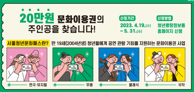 서울청년문화패스는 '서울시'가 사회에 첫 발을 내딛는 만 19세 청년들에게 연극, 뮤지컬, 무용, 클래식, 전통예술 등 문화예술 공연 관람 기회를 제공하고 문화예술분야 활성화를 위해 문화바우처를 지원하는 사업입니다.(연 20만원의 '문화이용권'을 지원하는 사업) ☞서울청년문화패스 안내