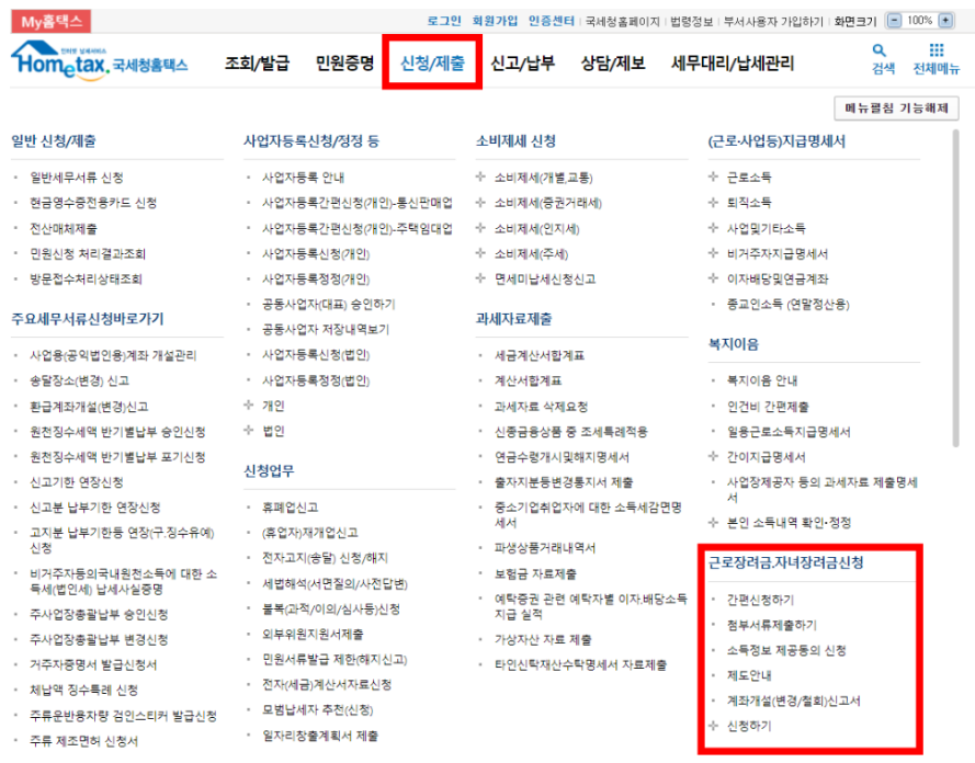 (홈택스 신청) 국세청 홈택스 화면 > 신청/제출 > 근로장려금 간편신청하기 (클릭) 로 들어가면 됩니다.