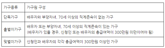 단독 가구는 2,200만 원 미만, 홀벌이 가구는 3,200만 원 미만, 맞벌이 가구는 3,800만 원 미만입니다. 단독가구는 배우자와 부양자녀, 70세 이상 직계존속이 모두 없는 가구입니다. 홑벌이 가구는 배우자 또는 부양자녀 또는 70세 이상 직계존속이 있는 가구입니다. (배우자가 있으면 신청인 또는 배우자의 전체 급여액이 300만 원 미만이어야 합니다) 맞벌이 가구는 신청인과 배우자 각각의 전체 급여액 등이 300만 원 이상인 가구입니다. 재산 기준은 다음과 같습니디.