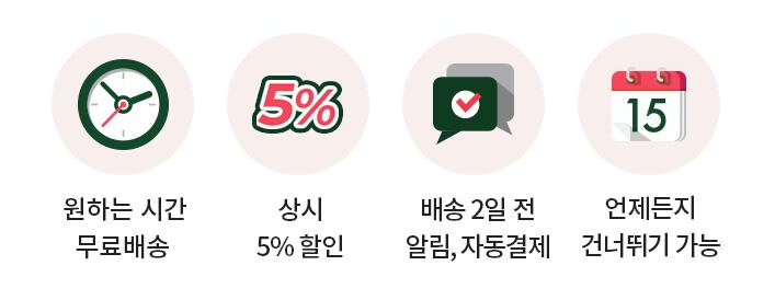 무료배송, 5% 상시 할인, 알림, 자동결제, 건너뛰기 등 다양한 편의서비스를 제공하고 있습니다.