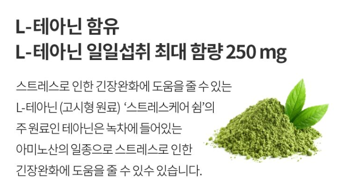 '스트레스케어 쉼'의 주원료인 L-테아닌은 녹차에 들어있는 아미노산의 일종으로 긴장완화에 도움을 줍니다.